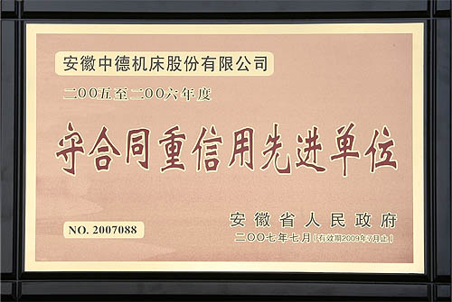 近日,安徽中德機(jī)床股份有限公司被安徽省人民政府授予2005-2006年度“守合同重信用先進(jìn)單位”這一稱(chēng)號(hào)。這也是我公司繼由馬鞍山市工商局、市人民政府、省工商局多次授予此類(lèi)稱(chēng)號(hào)后,再次獲得的更高級(jí)別的榮譽(yù)。