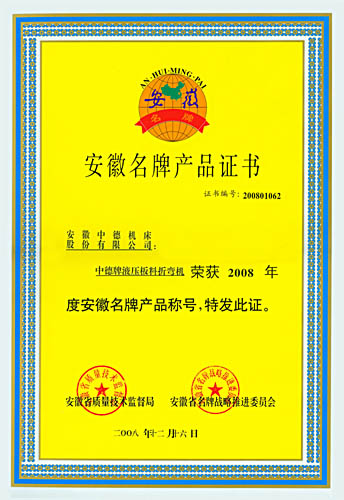 中德牌液壓板料折彎機喜獲2008年“安徽省名牌產(chǎn)品”的殊榮,這是繼2005年中德牌液壓擺式剪板機獲“安徽名牌產(chǎn)品”之后,中德機床的質(zhì)量和信譽又一次獲得認(rèn)可。與此同時,中德牌液壓擺式剪板機也順利通過安徽名牌產(chǎn)品的復(fù)審,證書的有效期將延長至2013年。